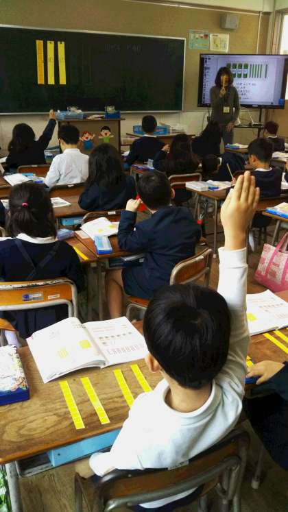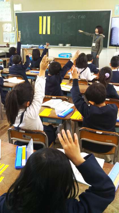 「大きなかず」の学習で、ひごの数をブロックに置き換えて10のかたまりを意識し、十の位、一の位の考え方や読み方を学びました。