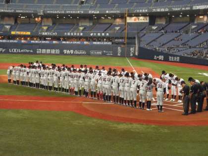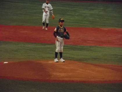 児童の代表が第1試合の始球式を務めました。スタンドから観戦しました。