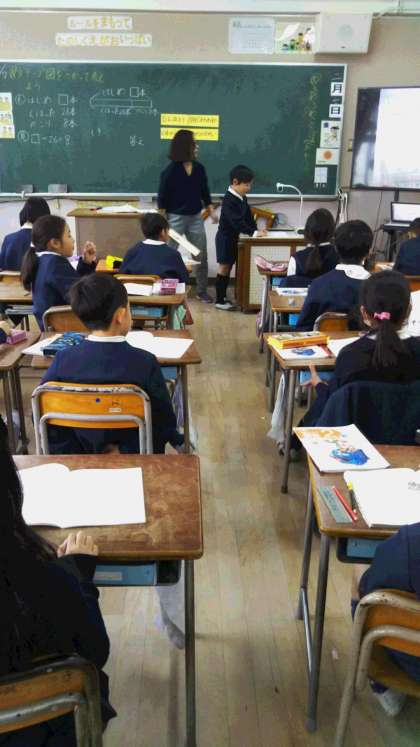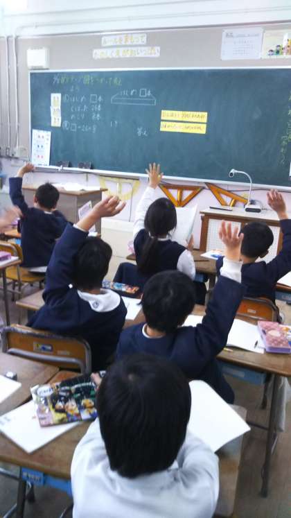 文章の問題を読んで、書かれていることをテープ図で表す学習です。はじめにあった数、使った数、残った数の関係をテープ図で表します。ノートをモニターに映しながら考えを説明しました。