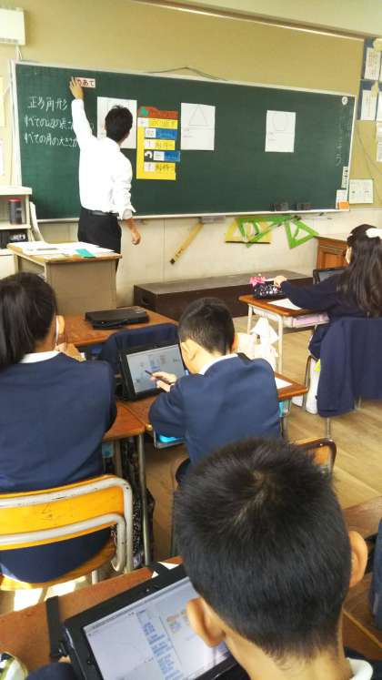 「正多角形の性質を利用してスクラッチを使って正多角形を作ってみよう」をめあてに、プログラミング学習を取り入れた算数の授業を行いました。辺の数や長さ、曲がる角度を順番に組み立てていくと正多角形を書くことができます。正三角形を書こうとプログラミングしたのに正六角形の半分ができました。なぜ?
