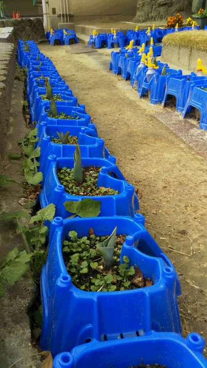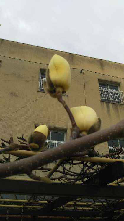 白木蓮がつぼみをふくらませ、チューリップの芽が出てきました。