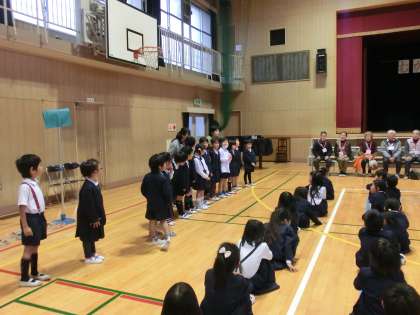 11月25日(火)9:20〜11:00 講堂で昔遊びをしながら地域の方と「あやとり」「おりがみ」「こま」「はねつき」「まり」「おはじき」「ビー玉」「お手玉」「べったん」「けん玉」の昔遊びをして交流を深めました。地域の会長さん、放課後の見守り隊の方・・・やさしくていねいに教えてもらいました。最後にお礼として運動会の団体演技「妖怪ウオッチ・ウェイクアップ」を披露し、お礼のプレゼント(手作りカレンダー)を渡しました。