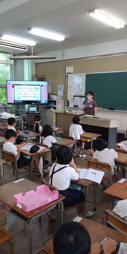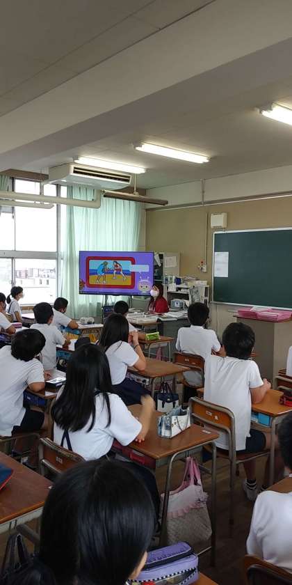 毎週水曜日の朝(8:35〜15分間)に全クラスで外国語活動を行っています。1時間目の学習が始まる前に、英語の音楽に合わせて歌ったりクイズをしたりと、楽しく活動しています。