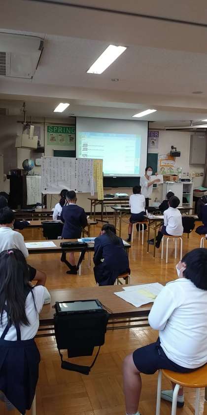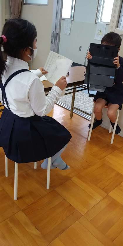 自分の宝物をクラスの友だちに紹介する活動です。今日はいつもの教室より広い多目的室で二人一組になって紹介する様子をタブレットで撮影したり、撮影した映像を見てよかったところやもっとよくなるヒントを話し合ったりしました。