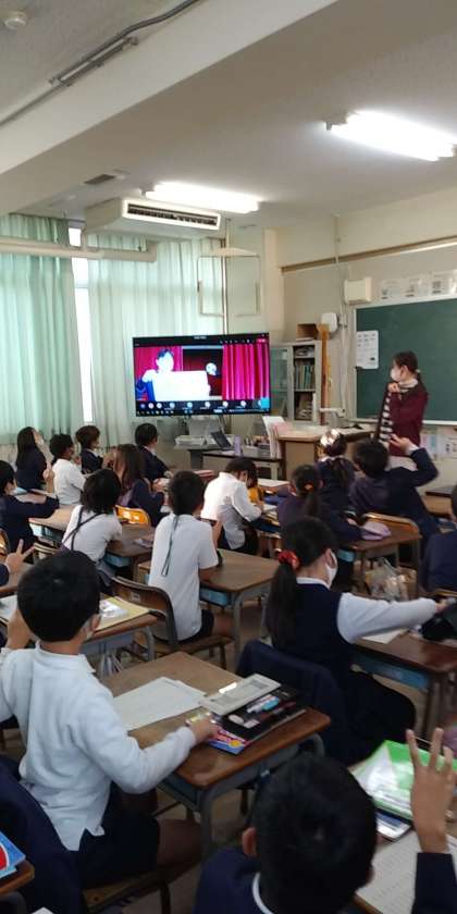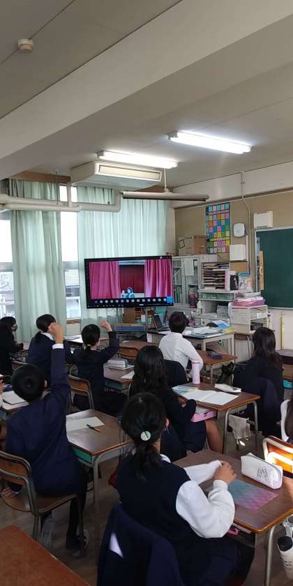 リモートで「カーテンの間を通り抜けたのはなんでしょう」というゲームをしました。カーテンの間を物か人が通り抜けます。「ランドセル」や「サッカーボール」、教員が一瞬通り抜け、何が通りすぎたか当てるゲームです。一瞬なのでなかなか難しかったですが、どのクラスも朝から大盛り上がりでした。