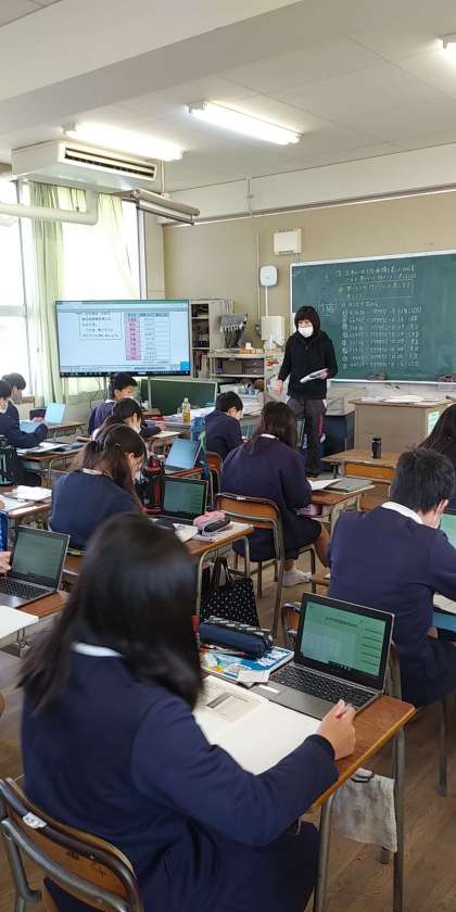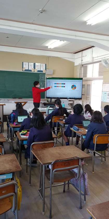 現在学校には1人1台学習者用端末(Windows機)が整備されています。5年生では、算数の時間にパソコンを活用して、日本の地区別面積を帯グラフや円グラフで表し、意見交流を行いました。