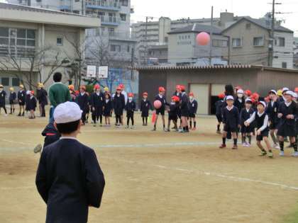 6年生がキャッチしたボールを1年生に渡して、投げさせる。