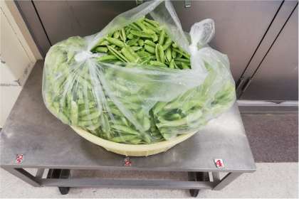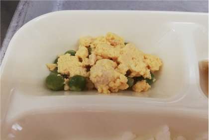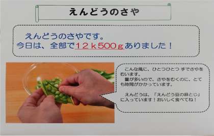 学校では継続して学校給食を行っています。昨日の献立は【ごはん】【牛乳】【あかうおのしょうゆだれかけ】【みそ汁】【えんどうの卵とじ】でした。約600食の【えんどうの卵とじ】を作るのに12.5Kgのえんどうが必要です。ひとつひとつさやをむいて調理します。