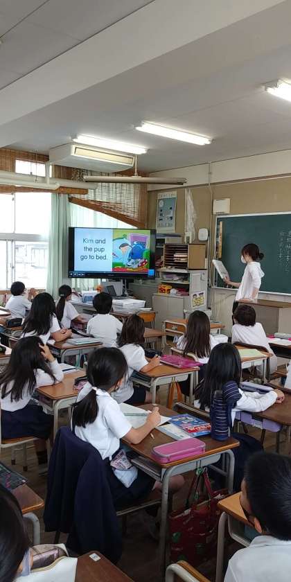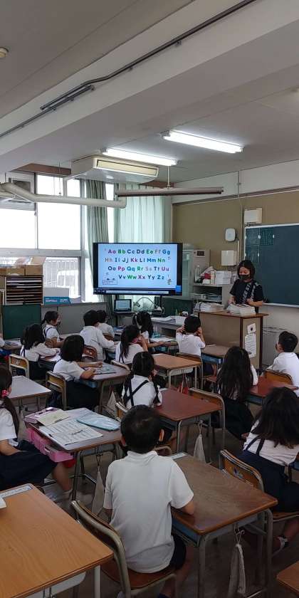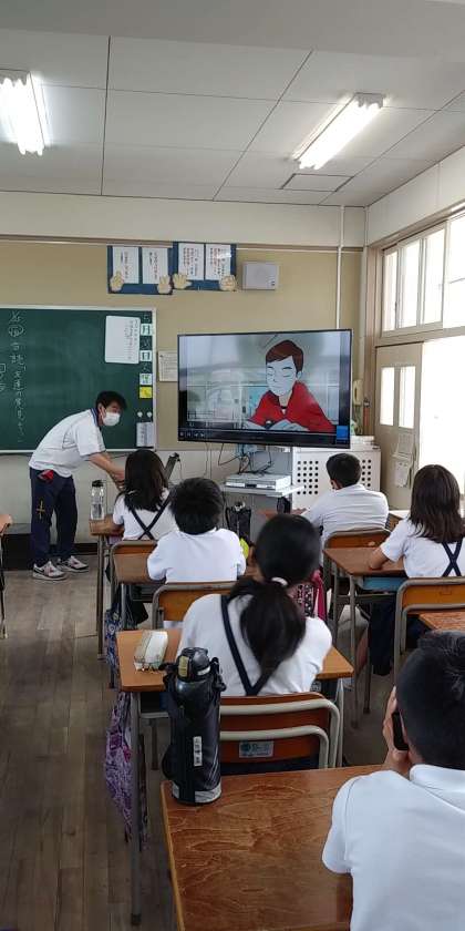 通常授業が再開し、全クラスでの外国語活動も再開しました。毎週水曜日全学級で1時間目の学習が始まる前に、英語の音楽に合わせて歌ったりクイズをしたりと、楽しく活動しています。