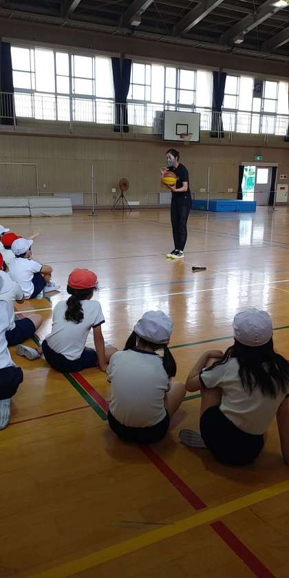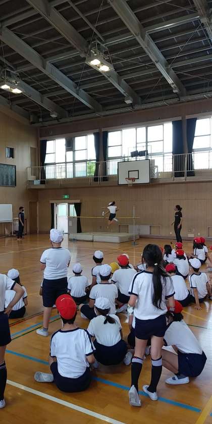 「夢・授業」は、オリンピックやワールドカップ等の世界大会に出場したトップアスリートが学校を訪問し、講演や実技指導を通して、児童生徒の「夢」を育み、スポーツへの興味関心を高め、体力向上を図ることを目的として実施されています。今日は【走高跳】で2007年世界陸上(大阪)等数多くの大会に出場し、日本選手権6回優勝、全日本実業団選手権14回優勝の記録をもつ福本幸(ふくもとみゆき)さんに来ていただき、5・6年生の児童を対象に【走高跳】の基本的な動き等を教えていただきました。