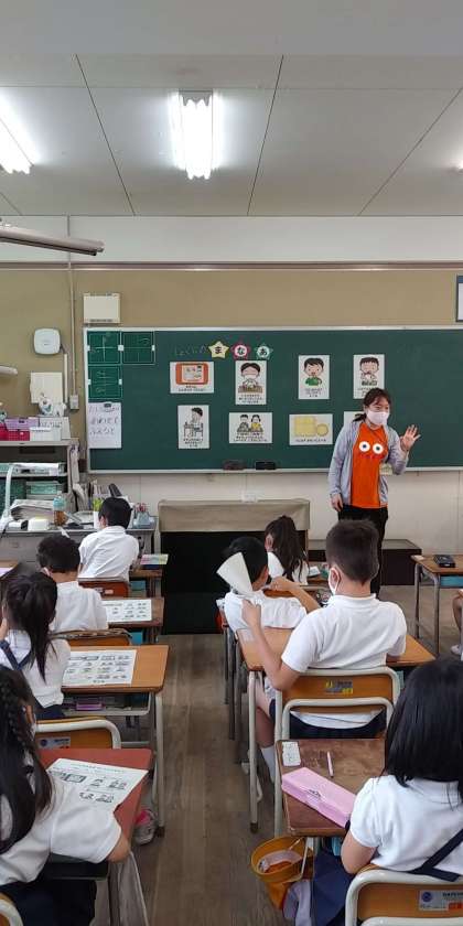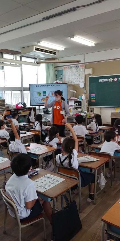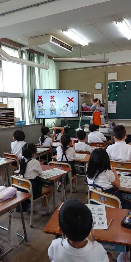 本校の栄養教諭が『しょくじのマナーめいじんになろう』という題材で実施しました。【おさらのおきかた】【しょくじのあいさつ】【しせい】等について、みんなが気持ちよく食べるために食事のマナーが必要であるということについて、〇×クイズ形式で考えることができました。
