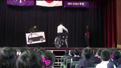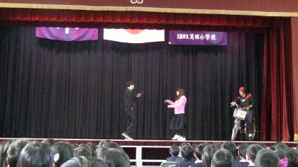 生活指導部の先生が中心となって寸劇「自転車の乗り方」