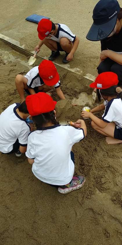 1クラスずつ運動場の砂場でどろ遊びをしました。家からプリンカップ等を持ち寄り、山を作ったり、水を流したりと、ふだんなかなかできない活動に楽しんで取り組むことができました。