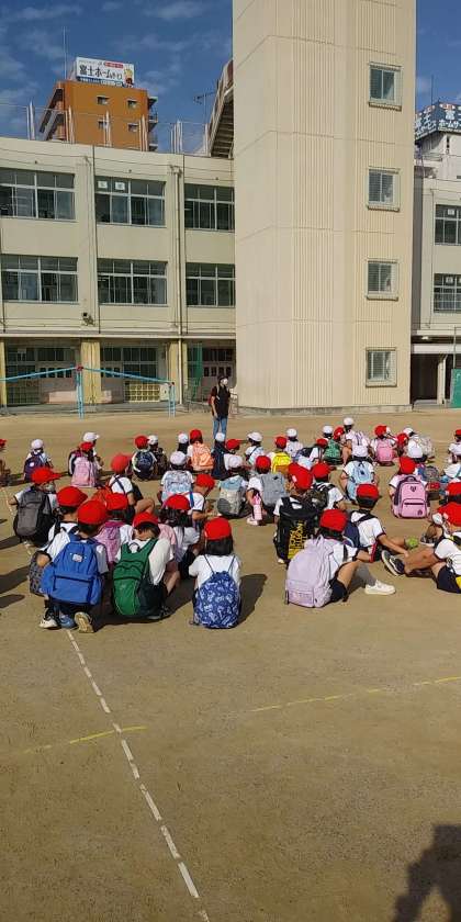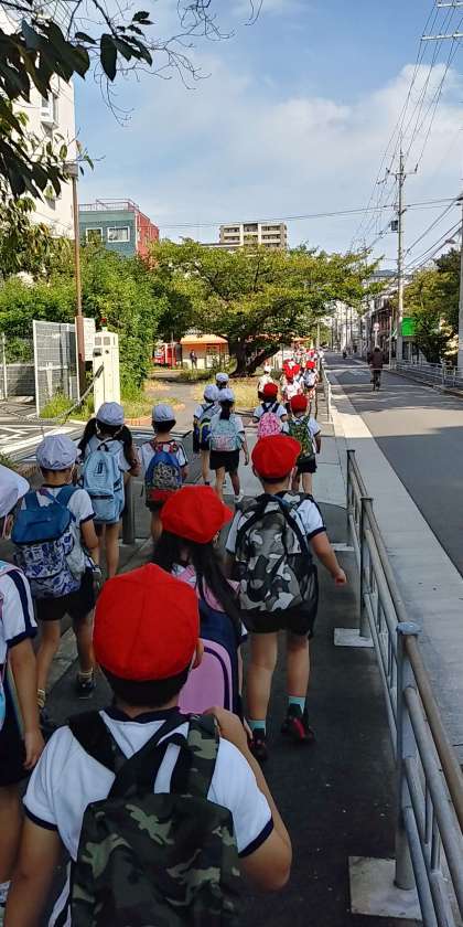 本日も晴天のもと、1年生が長居公園に向かって出発しました。20分程歩き、無事長居公園に到着しました。