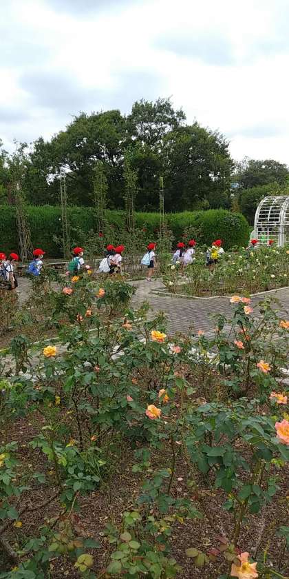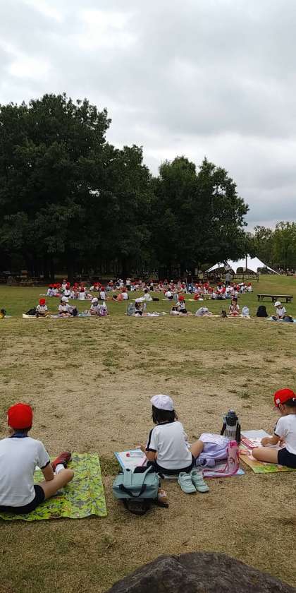 バラ園でいろいろな種類のバラを見たあとはお弁当です。芝生の上でクラスごとに大きな円を作って、お互いの距離をとってお弁当を食べました。
