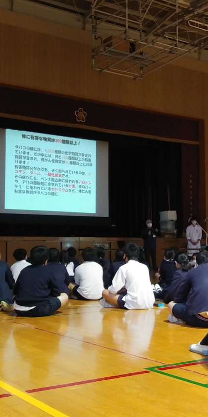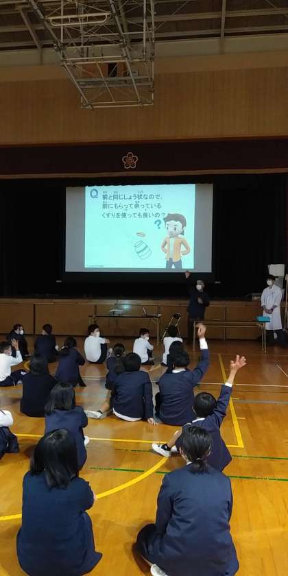 薬剤師の先生から【くすりの正しい使い方】について教えていただきました。薬をお茶に入れて溶かす実験をしたところ、薬の成分とお茶の成分が反応して黒い液体となり、薬を水で飲む大切さを実感することができました。また、授業の後半には【たばこの害】について詳しく教えていただきました。