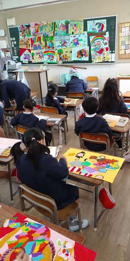 学期末個人懇談会の期間中に、講堂で作品展を実施します。時間は14:00〜17:00です。各学年平面作品と立体作品を出品します。現在どの学年も仕上げの段階です。子どもたちの力作をご期待ください。