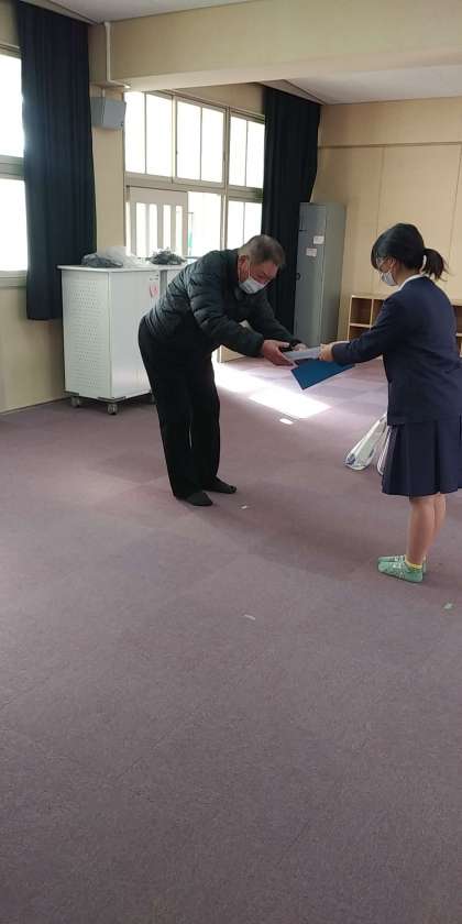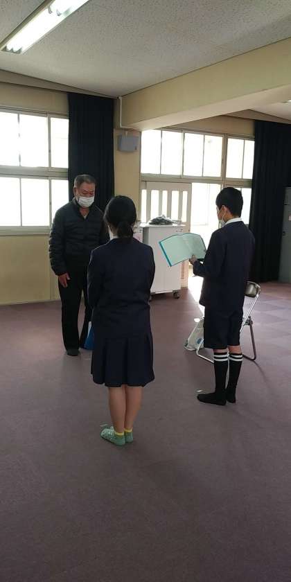 例年講堂でお礼の会を実施していますが、今年度も感染拡大の状況をふまえ、代表の方に来ていただき、Teamsを活用して実施しました。各学級で一人一人が書いたお礼の手紙を、6年生の児童代表より地域の方にお渡しすることができました。
