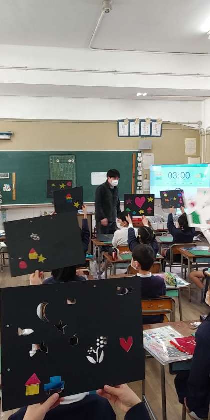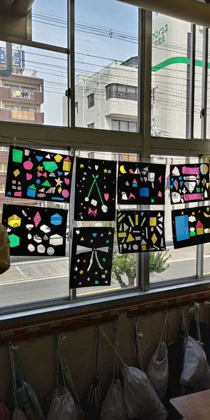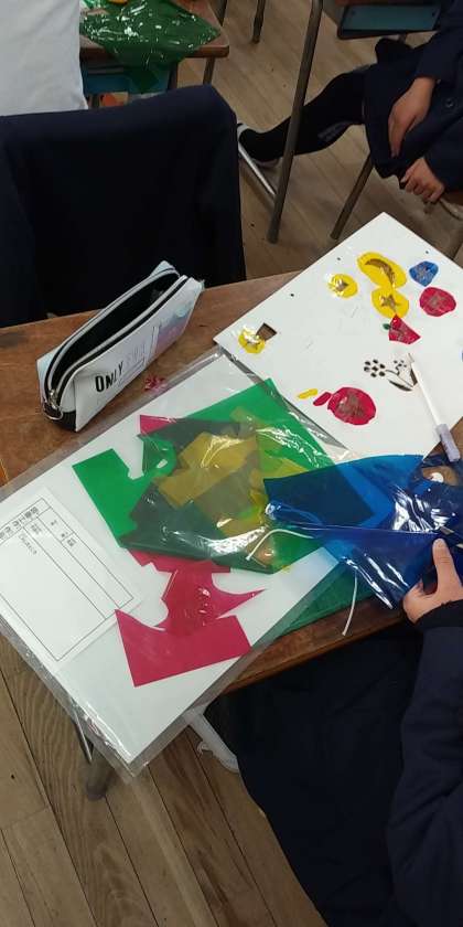 図工の時間にカッターナイフの使い方を学びました。実際に厚紙を切り抜き、裏からカラーセロハンを貼り付けました。色を重ね合わせたり、細かく分けて貼り付けたりして、カラフルな作品が完成しました。