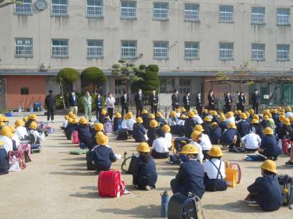 今年度は96名の新1年生を迎え、全校児童579名でスタートしました。青空のもと、運動場で密を避けて始業式を行いました。校長先生のお話のあと、本年度着任された教職員の紹介、異動された教職員の紹介等を行い、担任の先生・担当の先生の発表を行いました。その後各学年ごとに分かれてクラス分けを行いました。