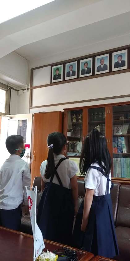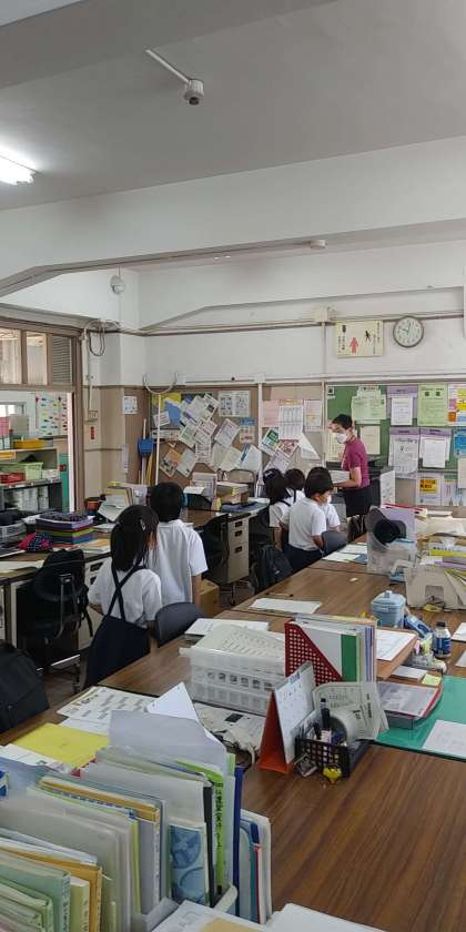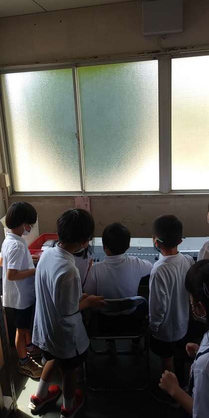各クラスで校内を巡りました。普段はなかなか入る機会がない職員室や放送室、校長室などに入り、どんなものがあるかを観察し、タブレットで撮影することができました。撮影した映像は後日発表に使う予定です。