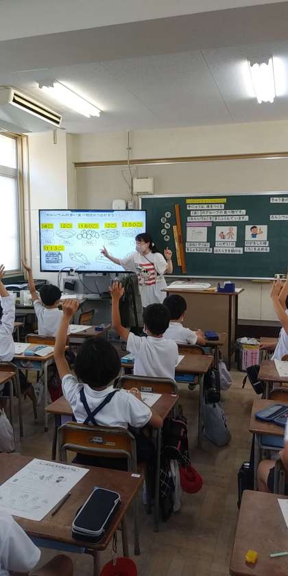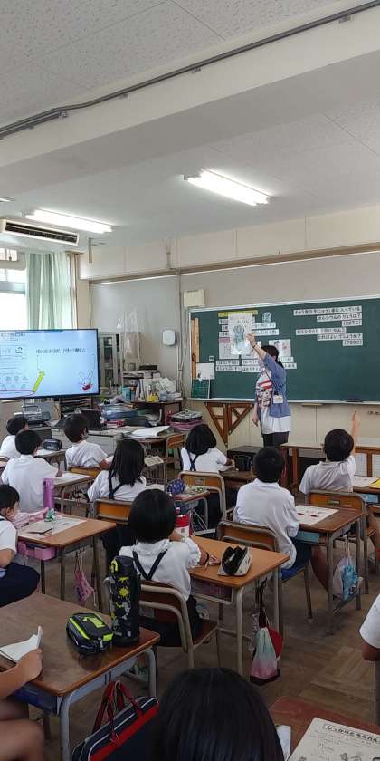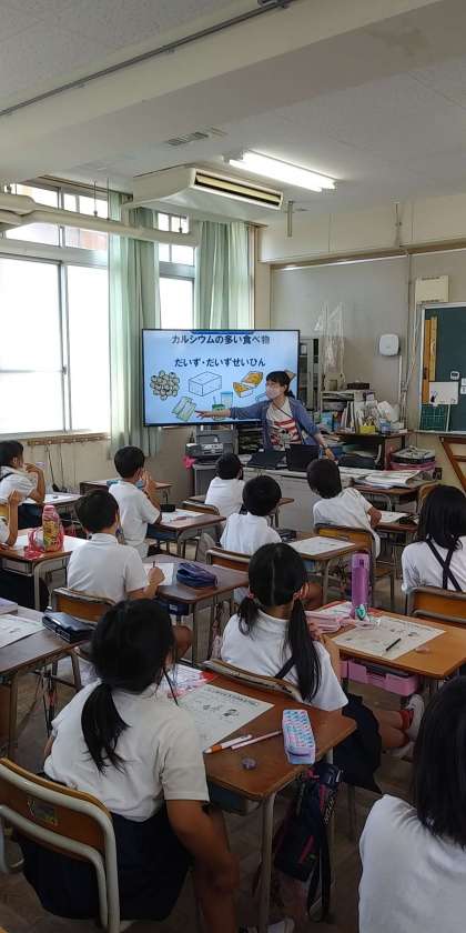 本校の栄養教諭が『しっかりとろうカルシウム』という題材で、各クラス1時間ずつ実施しました。授業を通して、カルシウムの働きや多く含む食品について知り、積極的にとろうとする意欲が高まりました。