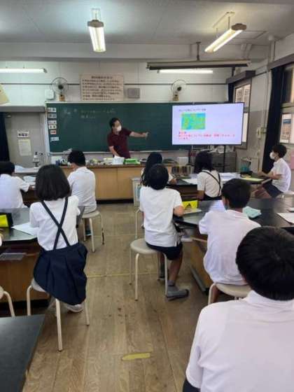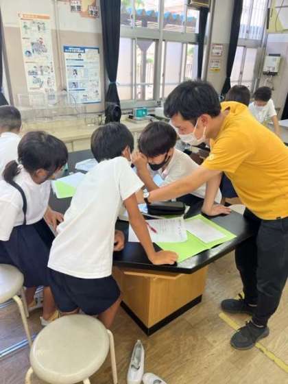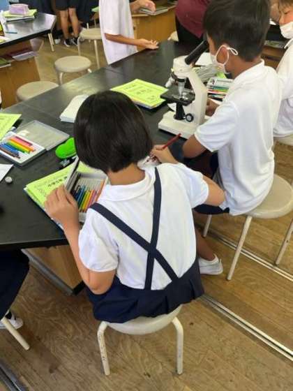 各学級1時間ずつ、校内のへちまのおしべの先についている花粉を顕微鏡で観察しました。班で協力し、倍率を変えながら細かい部分まで観察することができました。