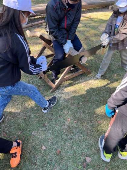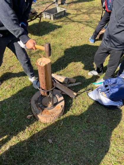 くさびやのこぎり、クラッカーなどを使ってまき割りをしました。この後このまきを使って、ピザを焼きます。