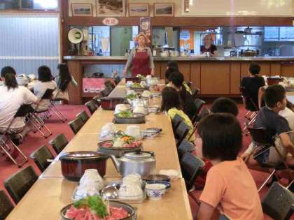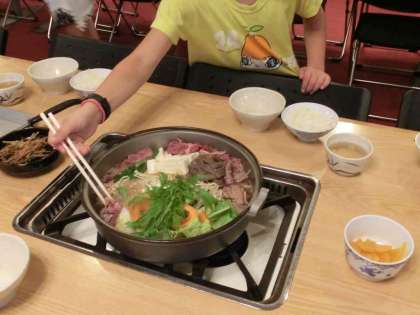 ごはん、お茶を入れる。すき焼きの作り方を宿舎の方から説明をしっかりと聴き、夕食の準備を完了しました。