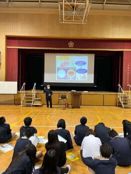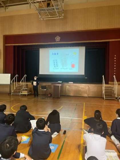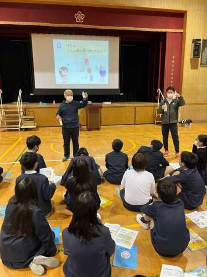 学校薬剤師の先生に6年生で1時間授業をしていただきました。薬をお茶に入れて溶かす実験をしたところ、薬の成分とお茶の成分が反応して黒い液体となり、あらためて薬を水で飲む大切さを実感することができました。また、授業の後半には【「たばこ」の何が悪い?】をテーマに、たばこの害についても詳しく教えていただきました。