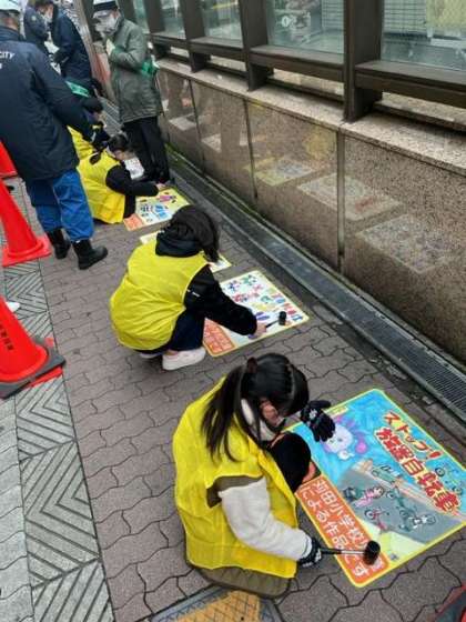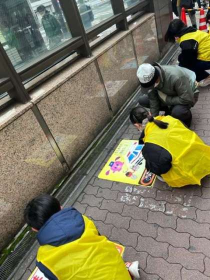 12月23日に、あびこ駅周辺で放置自転車対策にかかる児童絵画路面シート貼り付け作業が行われました。セレモニー、記念撮影を行い、作業を行いました。今年度は本校からは4名の児童の作品が選ばれました。依羅小、苅田南小、苅田小の3小の児童の絵画があびこ駅周辺に貼り付けられました。