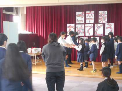 8日(水)5時間目に【卒業お祝い集会】をTeamsを活用して行いました。今年度の児童集会で人気の高かった【校長先生の命令です】【通り抜けたのは誰でしょう】の2つのゲーム、6年生教室での【突撃インタビュー】の生配信を行いました。6年生は今日のために作った雑巾を在校生にプレゼントしました。事前に撮影した各クラスからのお祝いの動画は、後日各教室で視聴する予定です。