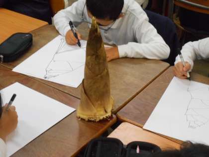 実物のタケノコをペンで描いていました。