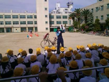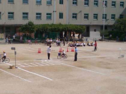 お天気に恵まれ、3年生は運動場で自転車の乗り方を学習しました。