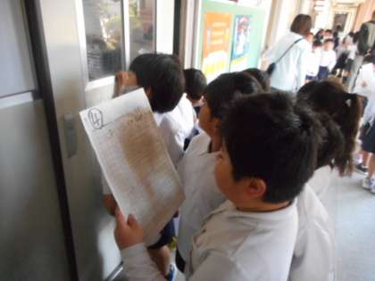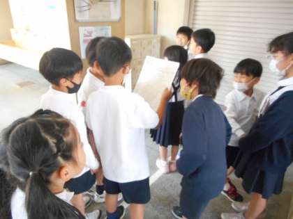 講堂に全員が集まってから、グループに分かれ、2年生が1年生を連れて学校を案内します。