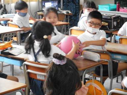 ボールをパスしていきます。集会委員の合図があったときにボールを持っていた児童が、集会委員から出されたお題をもとに、みんなにしょうかいするというゲームでした。