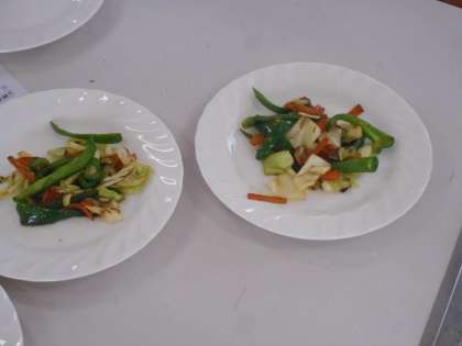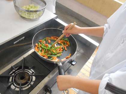 ニンジン、ピーマン、キャベツを使います。それぞれ、千切りや短冊切りをした後、順番に炒めていきます。