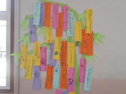 2年生の教室の前に、七夕飾りが掲示されています。