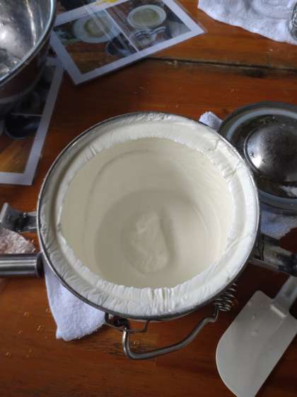 まず、アイスクリームの素を作ります。次に、それを専用の容器に入れ、さらに樽のような物の中にその容器とたくさんの氷を一緒に入れます。