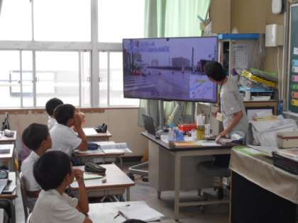 2018年9月にあった台風21号の被害の様子を映像で見ながら、水害からまちを守る人々について学習しました。