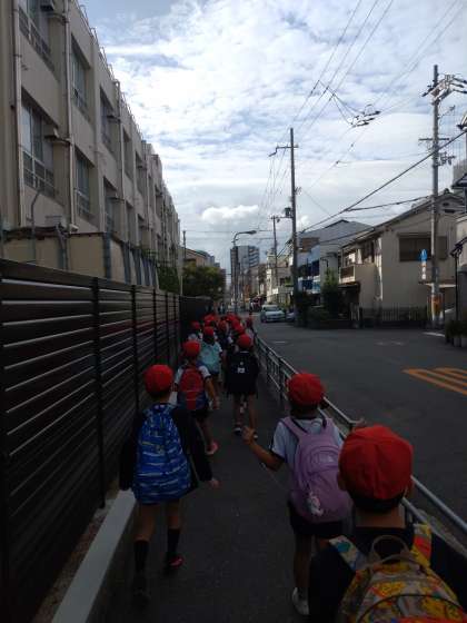 1年生の遠足です。大泉緑地に向けて出発です。春の遠足は天候に悩まされましたが、今日は良いお天気です。