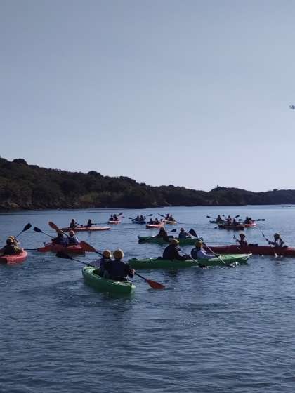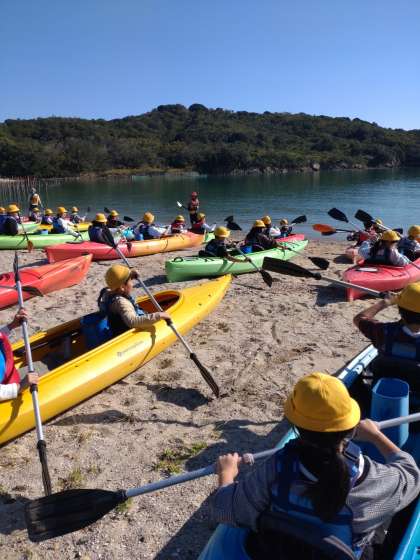 お弁当を食べた後は、半分に分かれて、シーカヤックとシェルクラフトの体験を交互に行います。