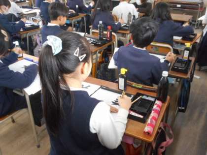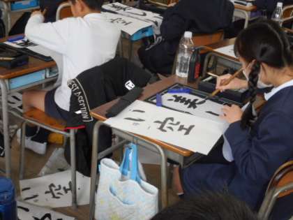 はじめに半紙で練習をしてから書初め用紙で書きます。