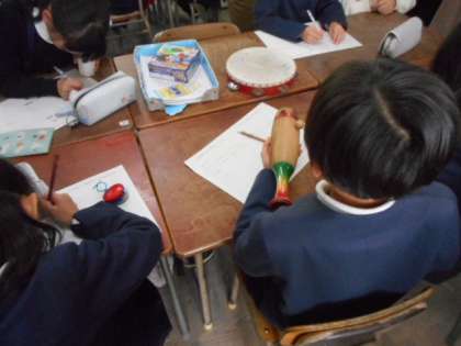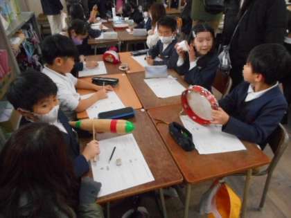 さまざまな楽器について、「音の出ている時・出ていない時」や「大きい音の時・小さい音の時」などについて調べていました。