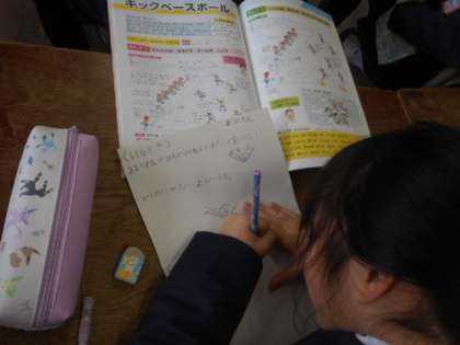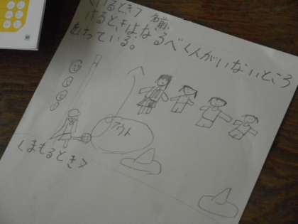 なので、体育の時間は「けるとき」「まもるとき」のそれぞれについて「作戦」「工夫していたこと」「気を付けていたこと」「他のチームを見ていて気付いたこと」などを、考えたり思い出したりして、まとめていました。
