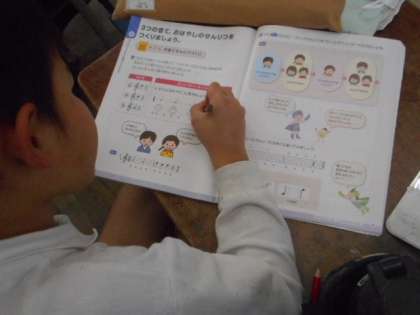 「3つの音で、おはやしのせんりつをつくりましょう」の学習でした。