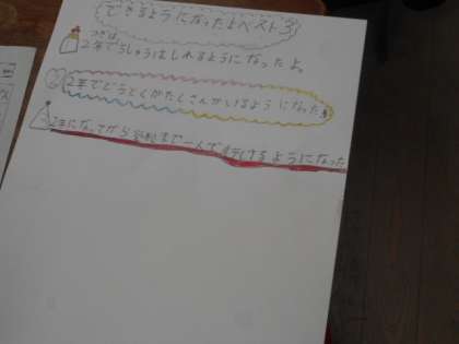 いろいろなことができるようになった2年生ですが、それぞれにベスト3を考えていました。やはり、多かったのは「九九ができるようになった」でした!