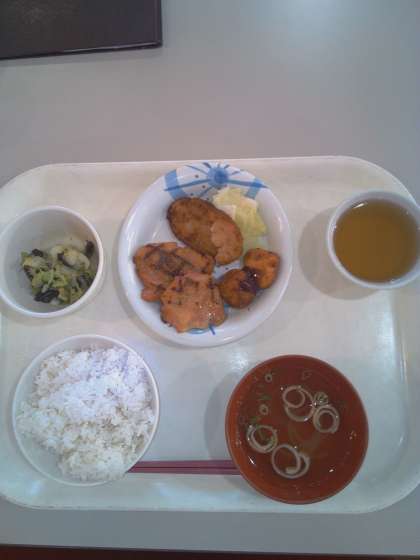 本日のメニューは「チキンステーキ」「ベーコンポテトバーグ」「たこやき」「ゆかり和え」「お吸い物」でした。