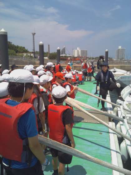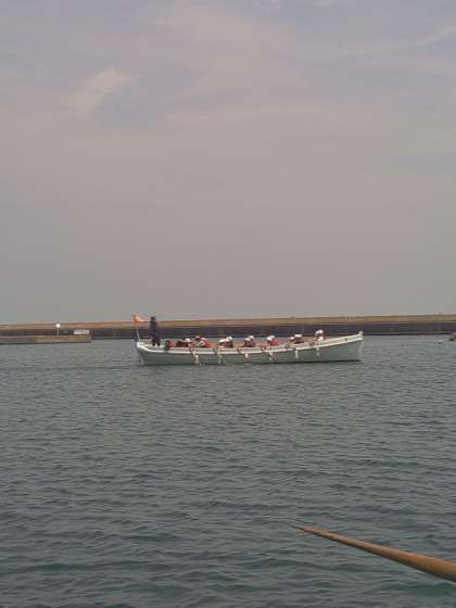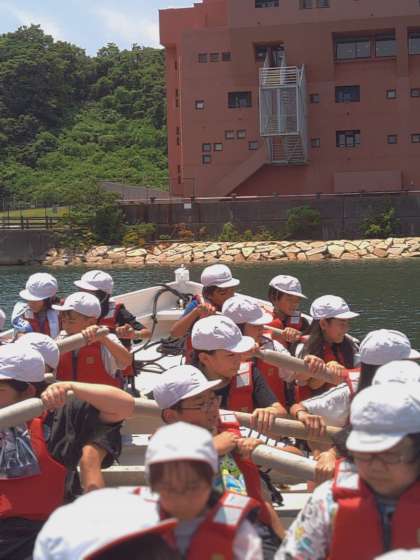 カッターは、2人で2つの櫂を協力して動かします。さらに全員であわせないと進みません。
