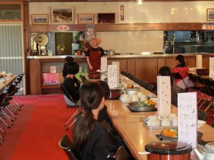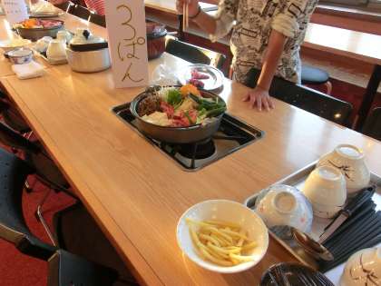食事係の人が、宿舎の人から作り方を聞き、なべに、お肉を入れて、